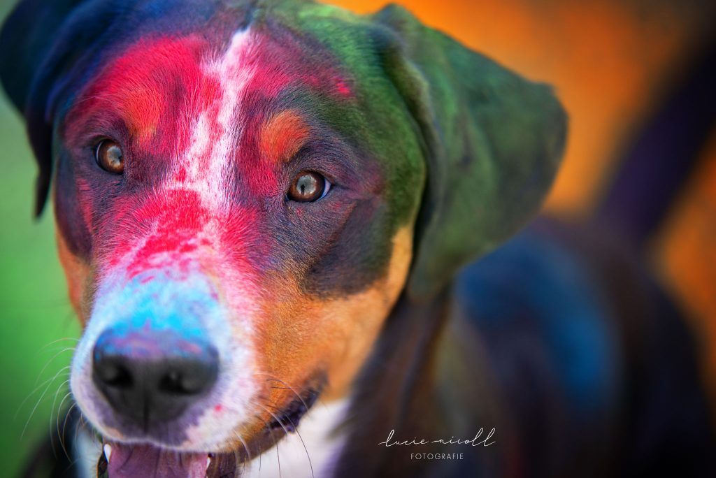Die Holi-Farben werden behutsam auf das Gesicht deines Hundes aufgetragen.